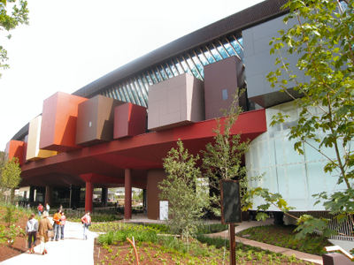 ガラス張りの壁に色とりどりの箱が突き出たファザード。